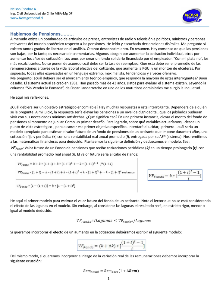 Frente a un tema de tanta importancia y con el particular enfoque de nuestra Empresa, -liderados por nuestros socios Nelson Escobar Arguedas y Mandana Behirad Safiri-, ponemos a disposición de la Comunidad, nuestras reflexiones acerca de las pensiones en Chile. "Hablemos de Pensiones en Chile", es un artículo que, esperamos que sea un aporte a la discusión y difusión de este candente tema. Si le interesa visualizar el documento en PDF, visitar https://drive.google.com/file/d/1EEdieWcWIWjxTPFeZUI2cq_VIAQMRRGE/view?u... |