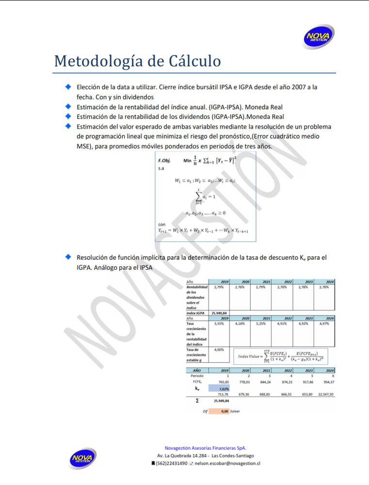 En Novagestion Asesorías Financieras SpA, llevamos años comprometidos con la entrega de análisis rigurosos y estudios de alto impacto que aportan valor a la comunidad. Como firma con amplia experiencia en consultoría, nos especializamos en la generación de conocimiento estratégico que facilita la toma de decisiones en distintos sectores. En esta ocasión, presentamos un estudio clave que aborda la estimación del valor del índice bursátil IPSA, -bajo contexto de incertidumbre-, con el propósito de ofrecer, a la Comunidad, información clara, relevante y fundamentada. Nuestro enfoque metodológico combina datos precisos con un análisis experto, asegurando que cada hallazgo contribuya al desarrollo y bienestar de la comunidad.
